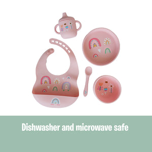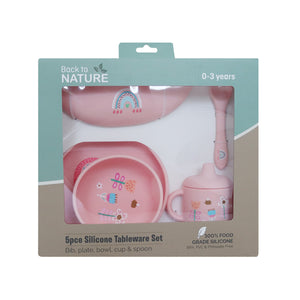 Elevate mealtime with Back to Nature’s Silicone Feeding Set 5pc! This all-in-one set features a bowl, plate, bib, spoon, and sippy cup, all crafted from soft, durable silicone. With adorable matching designs on each piece, it adds a touch of charm to every meal. Designed for easy cleaning and comfort, this set ensures a mess-free and stylish dining experience for your little one.